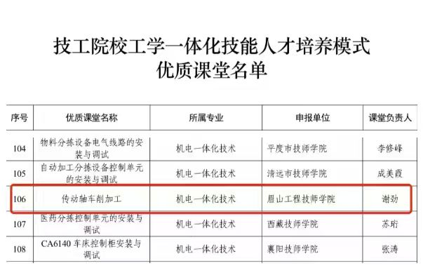 本网消息(黄子旸 报道)捷报再传!近日,人力资源社会保障部办公厅公布了全国技工院校工学一体化技能人才培养模式优质课堂遴选结果,眉山工程技师学院谢劲团队主讲的《传动轴车削加工》课堂成功入选。。